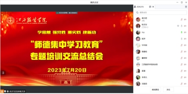为进一步加强亚洲天堂网站思政课教师政治素养和师德师风建设,深入贯彻落实习近平总书记关于教育的重要论述,落实“师德假设第一标准”要求,筑牢学院教师为党育人、为国育才初心使命,按照学校关于开展“师德集中学习教育”专题学习的通知要求,学院于6月初-7月中旬组织学院全体教职工通过“线下+线上”“理论+实践”“学习+培训”的方式开展专题培训。为了更好地总结经验、交流心得、推进发展,7月20日上午,亚洲天堂网站通过线上+线下相结合的方式召开“师德集中学习教育”专题培训交流总结会。会议由学院党总支副书记陈洋安主持,学院党政领导班子成员、全体教师参加会议。