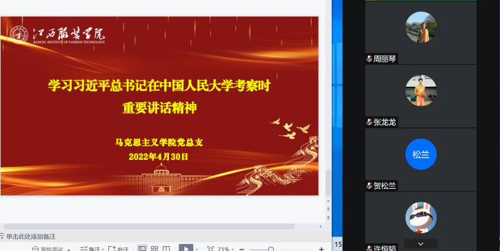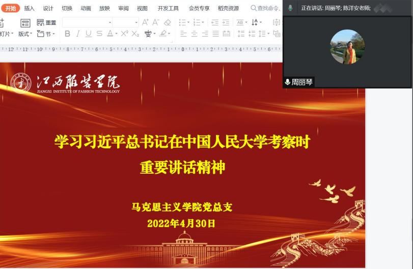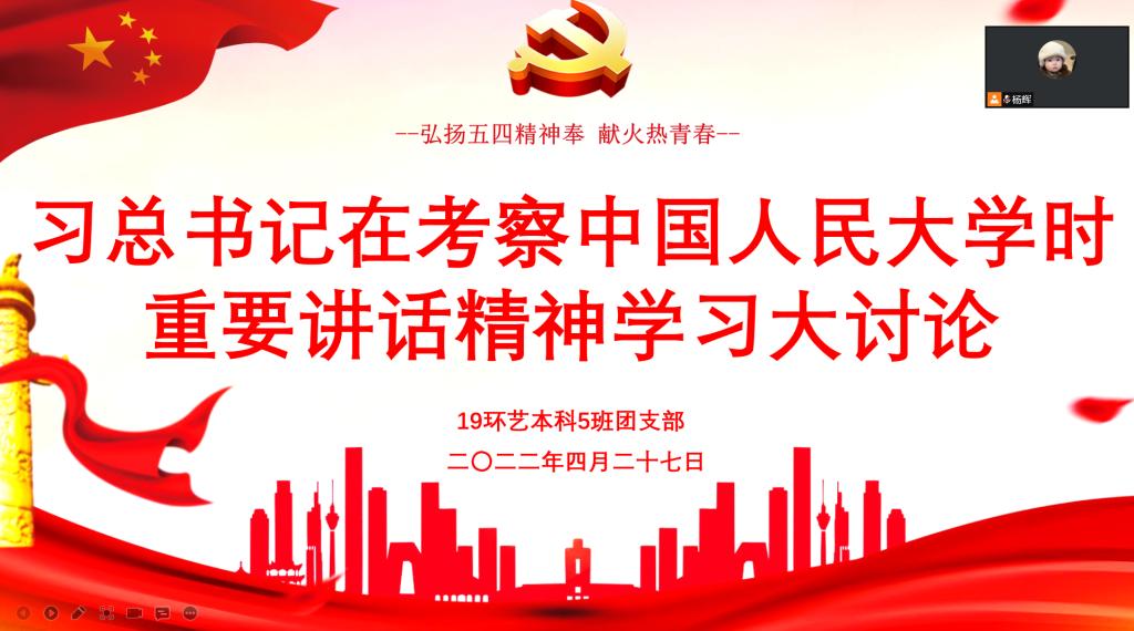 4月27日晚,亚洲天堂网站党总支副书记陈洋安同志在线上参加了我校艺术设计学院19环艺本科5班团支部学习习总书记考察中国人民大学重要讲话精神学习大讨论主题活动,大家通过观看视频、成长分享、交流互动等方式,一一分享自己的学习感受。