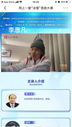 为深入学习贯彻习近平总书记在北京冬奥会和冬残奥会表彰大会上的重要讲话精神,回顾中国冬奥历程,领会冬奥精神,引导我校大学生勇于担当,志存高远,脚踏实地,心系国家,在奋斗中书写人生华章,2022年4月16日下午我校亚洲天堂网站组织师生共同观看了由教育部社科司、北京市教工委等单位指导,人民网推出的“同上一堂‘冰雪’思政大课”。