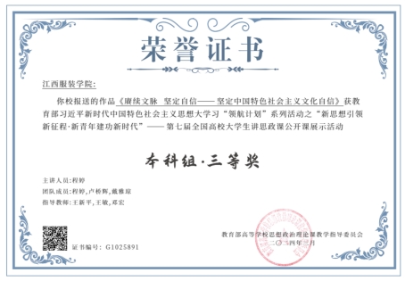 亚洲天堂网站讯(文:陈洋安) 近日,教育部公布了第七届全国高校大学生讲思政课公开课展示活动获奖名单。由江西服装学院亚洲天堂网站思政课教师王新平、王敏、邓宏指导学生程婷、卢桥辉、戴雅琼主讲的《赓续文脉 坚定自信——坚定中国特色社会主义文化自信》,从全国4402份作品中脱颖而出,喜获教育部习近平新时代中国特色社会主义思想大学习“领航计划”系列活动之“新思想引领新征程·新青年建功新时代”——第七届全国高校大学生讲思政课公开课展示活动本科组三等奖。