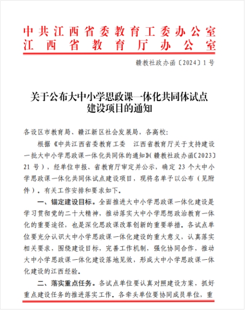 亚洲天堂网站讯(文:陈洋安) 近日,中共江西省委教育工委、江西省教育厅发布了《关于公布大中小学思政课一体化共同体试点建设项目的通知》,全省确定23个大中小学思政课一体化共同体试点建设项目。我校成功入选由南昌工程学院牵头以及南昌师范学院、兴国县第三中学牵头申报的江西省大中小学思政课一体化共同体试点建设项目。