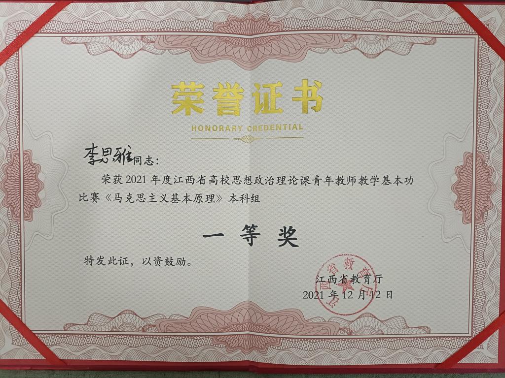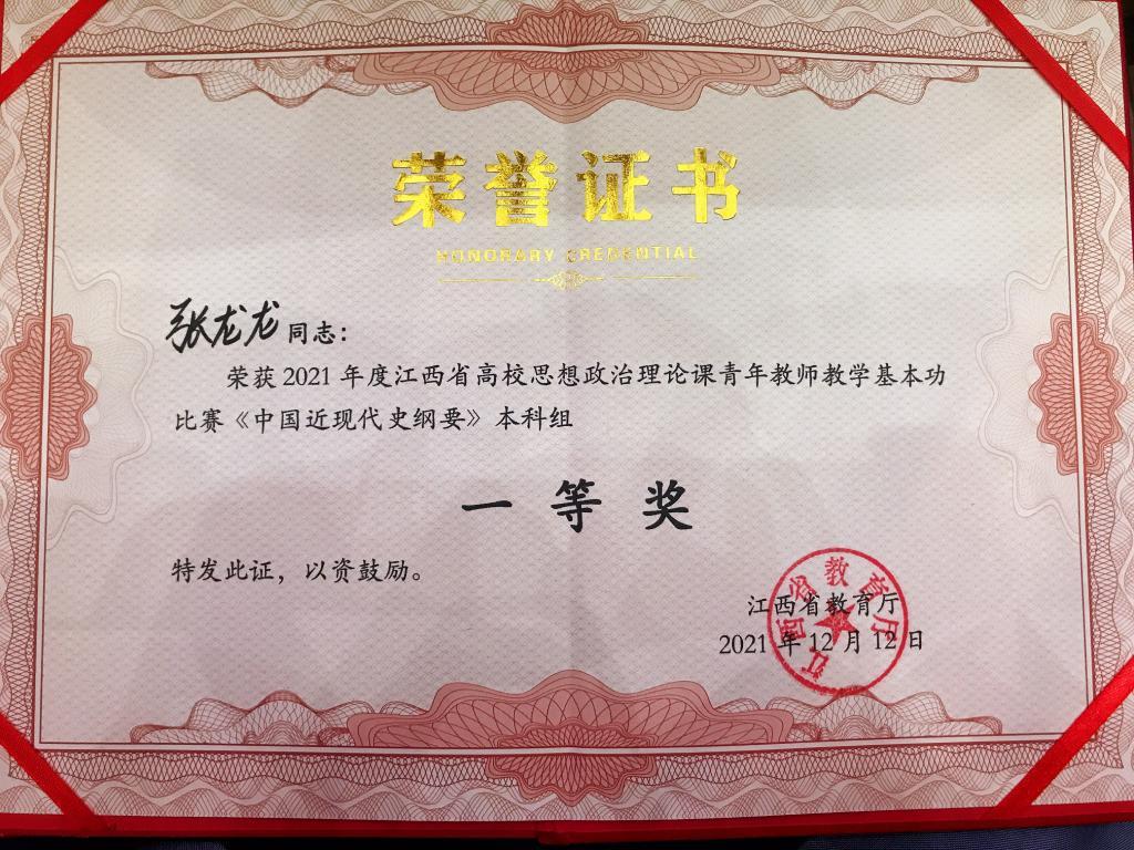 12月12日,由江西省教育厅主办的2021年度全省高校思政课青年教师教学基本功比赛决赛圆满落幕,我校亚洲天堂网站教师张龙龙荣获《中国近现代史纲要》本科组比赛一等奖;李思雅荣获《马克思主义基本原理概论》本科组比赛一等奖;徐华磊荣获2021年度全省大中小红色文化课程教学比赛一等奖,实现了三名思政课教师在该项赛事中同时获得一等奖的新突破。